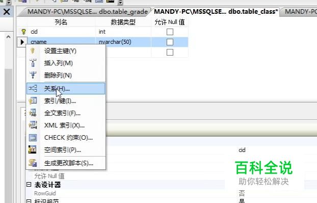 然后右键单击班级表,在弹出的菜单中选择关系选项,如下图所示