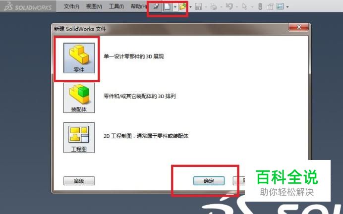 如下图所示, 打开SolidWorks软件, 新建一个空白的零件文件。