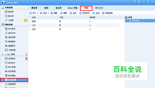 首先把你的iPhone用数据线连上电脑,然后打开iTools,如图: 等待iTools识别出你的iPhone后,即“×××”。然后点击 信息管理> 日历