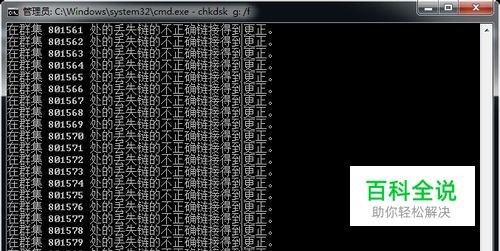 输入:"chkdsk 盘符号 /f", 比如,想检测修复G盘,输入命令:"chkdsk g: /f" ,回车。 "chkdsk"的意思是checkdisk,译成中文就是磁盘检测。