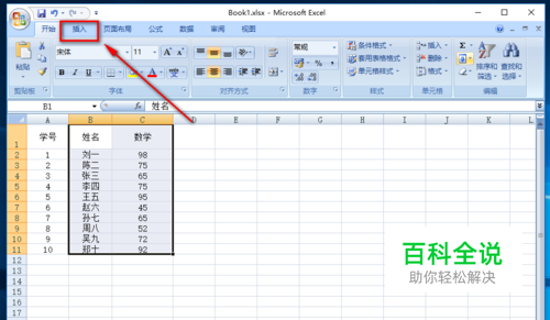 选择姓名和成绩这两列,然后选择上方菜单中的“插入”