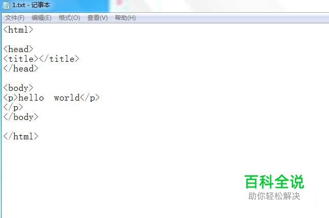 然后输入html基本内容,如下图所示: 代码: <html> <head> <title></title> </head> <body> <p>hello world</p> </p> </body> </html>