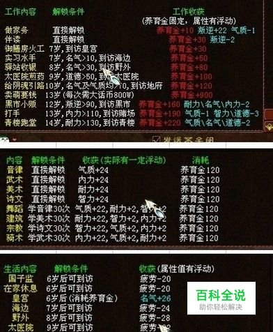 9岁: 9岁咱们要学习什么了?孩子到了9岁咱们就要先去找装备了,因为咱们要解锁工作内容(太医院煎药)因为他需要道德值要大于50,所以咱们可以找垃圾的孩子二级装备把道德搞到大于50后,在去生活中的太医院这地点解锁。那九岁要干的事就是去太医院煎药赚钱学名气然后疲劳值大于300了就去太医院减疲劳,学习名气,当你的孩子到达10岁的时候你的名气大概能学到1000左右数值。这样孩子就可以到达10岁了。