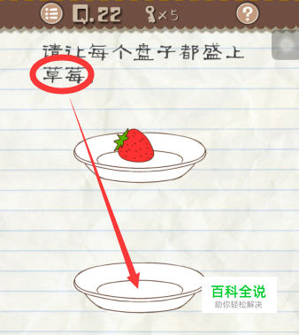 【第22关】 将草莓那两个字放到下面的盘子内,这样两个盘子里面就都有草莓啦。