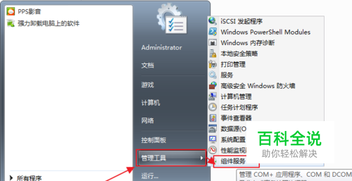 用鼠标点“开始按钮”→“管理工具”→“组件服务”。 也可以在“运行”里输入“services.msc”。