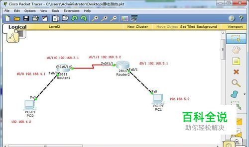配置路由器2的两歌端口地址。分别将f0/1地址为192.168.5.1,s0/1/1地址为192.168.3.2。