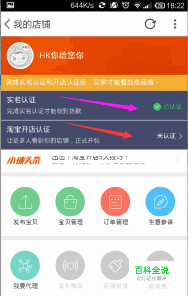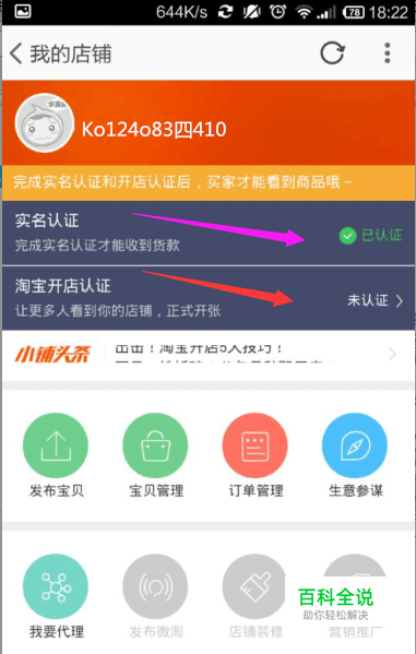 第七,开始认证店铺 支付宝实名未认证点击粉色箭头指向开始认证即可。 支付宝已经实名认证点击红色箭头开始认