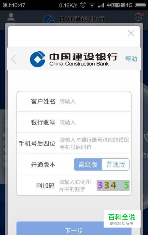 输入我们的用户名和银行账户,手机号后四位,选择开通手机银行版本,输入验证码,点击下一步