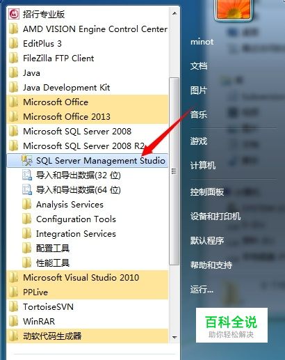 首先我们打开SQL SERVER自带的数据库管理工具,从开始菜单中可以找到,如图点击进去;