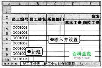 新建员工工资表格 新建“员工工资表”,在其中输入“员工编号”、“员工姓名”、“所属部门”等字段信息及详细的员工编号,再根据需要设置单元格格式。