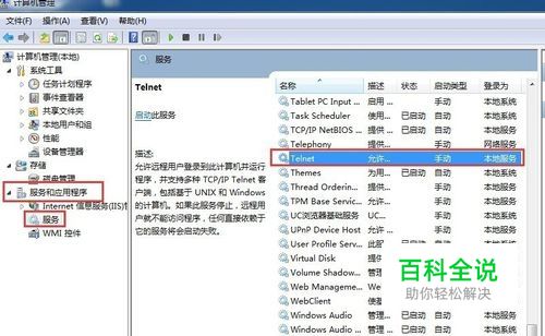 如果ping不通,telnet服务就被关闭了。需要开启服务,在“桌面”->“电脑”->“管理”->"服务和应用程序"->"服务"->"Telnet"->开启服务。如果有Telnet服务的可以跳过下一步。