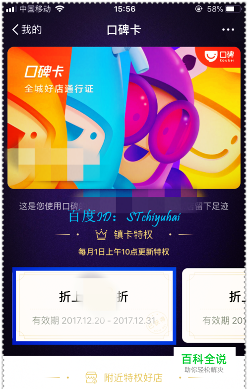 在门店列表中,有些有些支持口碑卡优惠,这样的店铺可以使用,如果没有这样标识的则无法使用优惠。