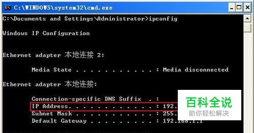 那么怎么查看自己的IP地址呢? 我们以XP系统为例 :打开“开始”菜单——选择“运行”——输入“cmd”——按下“Enter”回车键,这样做可以打开“命令提示符”,在命令提示符中输入“ipconfig”,按下“Enter”回车键;系统给出的结果看下图所示: