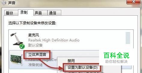 开启系统立体声混音 由于给对方播放视频并不是通过麦克风来发声,所以首先我们要开启Win7的立体声混音功能,右键点击右下角的喇叭图标选择“录音设备”,如果这里只显示麦克风的话,还需要点击右键选择“显示禁用的设备”,然后右键点击“立体声混音”选择设置为“默认设备”,另外还需要双击“立体声混音”进入设置,将“通过此设备播放”选择为“扬声器...”