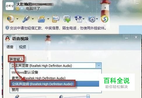 在完成了系统声音的设置之后,还需要设置QQ语音的属性,和任意一个好友聊天打开聊天窗口,点击麦克风图标旁边的下拉菜单选择“语音设置”,将“声音输入”选择为“立体声混音...”即可,接下来再重新给对方放视频就可以正常听见声音了。需要注意的是,如果要和对方进行语音对话的话,要在系统和QQ 中的声音输入设备设置为“麦克风”。