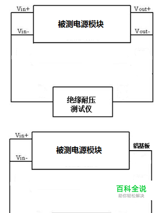 8.5 绝缘耐压 8.5.1 测试说明:检查电源模块的电气绝缘设计是否符合规定的技术要求。 8.5.2 测试方法: a) 绝缘耐压试验在标准大气条件下进行; b) 如下图所示连接设备,在切断工作电源的情况下,分别短路输入端子及输出端子,在输入端子对输出端子、输入端子对铝基板之间进行测试。 c) 调节绝缘耐压测试仪的电压调整旋钮,使得被测电源模块在5~10S内逐渐增加到规定的试验电压(1KV或1.5KV)后,保持1min。同时观察绝缘耐压仪电流表指示值(漏电流)及模块有无击穿或闪烁现象。 d) 耐压测试完毕后,应在5~10S内逐渐降低试验电压,在降到工作电压以下时,方可切断试验电压。