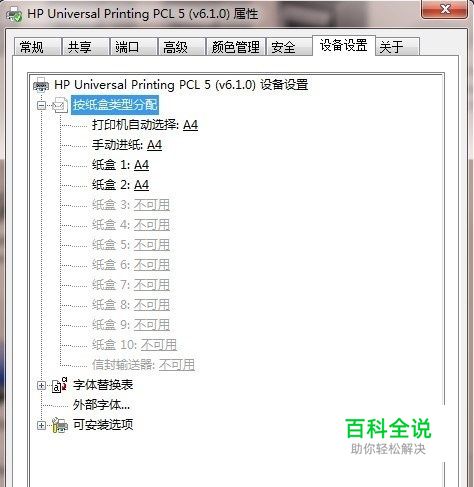 在HP Universal Printing PCL5(V6.1.0) 驱动图标上用鼠标右击,选择打印机属性-设备设置