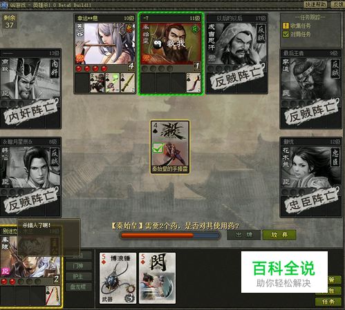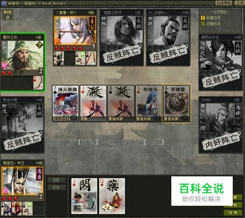 实战:实战的时候,或许反贼很给力的杀你,而内就在一边休息;也可能是另个极端,忠臣并不是很给力,而内奸跟个忠臣一样相当给力。这两种情况都反映了一点,主公这边并不是很齐心,上来不秒掉一个反贼而本方的忠内中挂掉一个,那意味着主要赢的难度系数加大。但也不是意味着输了,这个到后面的变数还是很大的。在具体的八人战中,忠臣宁死也要有保护主公万全的想法,留着药随时准备救主,尤其是在主贫血的困乏期。有时这颗药或许就是扭转局面的钥匙,很好的把握每一次机会,求胜的欲望需要占据自己,不要轻言放弃。这个就是一场战争,有胜者为王的成功,和败者寇的伤感。实战中,有杀可以不出,有些闪可以不闪,有些群可以不放,有些时候对手牢住了,探囊釜底等可以先留着不用等等,很多经验可以慢慢积累的。 上图为虞姬是主,本来当主不错的一个武将,可是由于两边的武将都是忠臣,上来虞姬就秒掉曹操两滴血,这个是误伤,也是实战中的大忌,敌不明就乱走的。最后在反贼的合力下三轮秒掉。