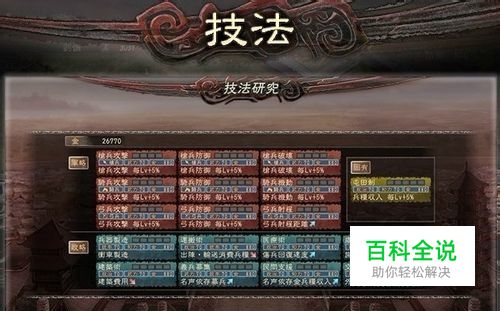 你至少要建造2个技法研究所,并且拥有三名武将,选择技法研究所就可以研究你想要的技法 技法研究共分为三大部分:军略(战略)、策略、固有。 顾名思义,军略(战略)主要是针军事的技能研究,其中包括枪兵、骑兵、弓兵的攻击、防御、枪兵破坏能力、骑兵机动性、弓兵射程三个兵种的多个兵科的研究方向。具体效果如下: 攻击:每级增加枪兵/骑兵/弓兵5%的攻击 防御:每级增加枪兵/骑兵/弓兵5%的防御 枪兵破坏:每级增加枪兵5%的破坏能力 政略,主要是针对科技的研究。其中包括:兵器制造、搬运术、医疗术、岁入改善、建筑术、义兵募集、民间支援、交涉术八个技法。