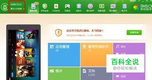 360手机助手识别小米盒子,初次识别可能时间要的比较久,请耐心等待一下。 注意点:A.用360手机助手初次和小米盒子识别的时候可能会卡住。遇到这种情况的话可以重新插拔一次再次启动识别。 B.如果有中途提示要安装驱动需要确认什么的话,一定要点允许或者确认哦。
