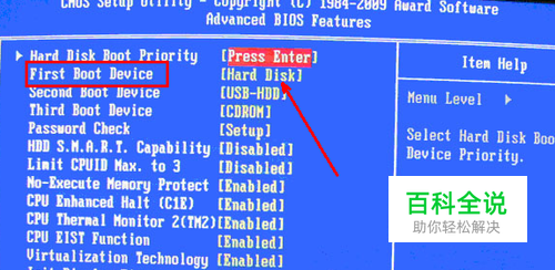 在这个高级设置中,我们可以看到有一个第一启动项的设置,即first boot字样的选项,选择到这里,然后按回车。