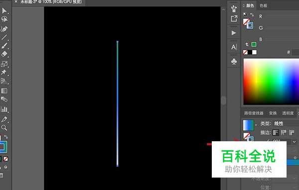 打开电脑中的AI软件创建一个黑色背景色的画板,然后绘制一个线条,将填充给关闭,然后添加一个渐变色的描边。