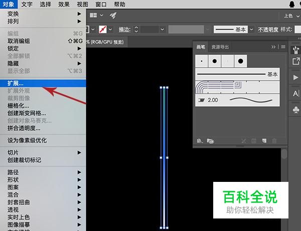 接着点击渐变线条,在上方菜单中选择“对象-扩展”,对形状进行连续两次扩展操作。