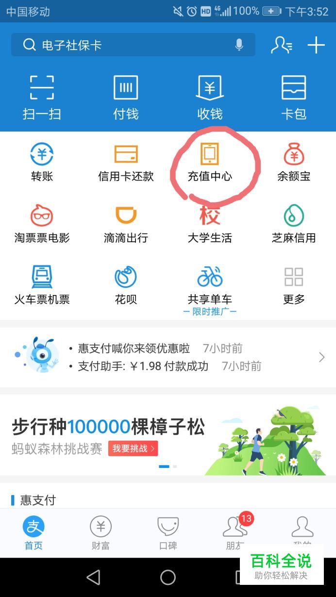 首先打开支付宝,点击充值中心,如图。