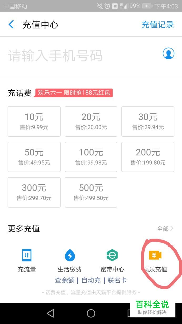 在充值中心界面选择右下角的娱乐充值,如图。
