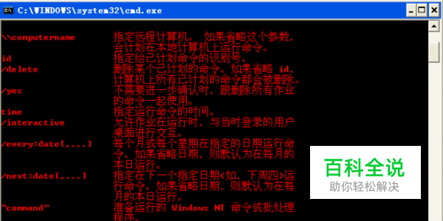 参数说明 : 无参数: 显示所有已设置的计划命令情况。 \\computername : 指示执行该命令的计算机名,如省略则在本机执行。 time : 命令执行时间 , 将时间以 24 小时标记( 00:00 [ 午夜 ] 到 23:59 )的方式表示为小时:分钟 /interactive : 当程序执行时是否与正在登录的用户进行交互。 /every:date[, ] : 指定程序执行的日期 ,将 date 指定为星期的一天或多天 (M,T,W,Th,F,S,Su) ,或月的一天或多天(使用 1 到 31 的数字)。用逗号分隔多个日期项。如果省略了 date ,将假定为该月的当前日期。 next:date[, ] : 指定程序下一次执行的日期。 ″command″ : 定时执行的 命令、程序( .exe 或 .com )或批处理程序( .bat 或 .cmd )。当命令需要路径作为参数时,请使用绝对路径,也就是从驱动器号开始的整个路径。如果命令在远程计算机上,请指定服务器和共享名的 UNC 符号,而不是远程驱动器号。 如果命令不是可执行 (.exe) 文件,必须在命令前加上 cmd /c ,例如: cmd /c dir > c:\test.out AT [\\computername] [[id][/delete][/yes]] 参数含义: id : 分配给计划命令的识别号码,可由不带参数的 AT 命令查到。 /delete : 取消指定的计划命令,如果 id 省略的话,取消所有的计划命令。 /yes : 强制对所有的取消询问回答 yes 。
