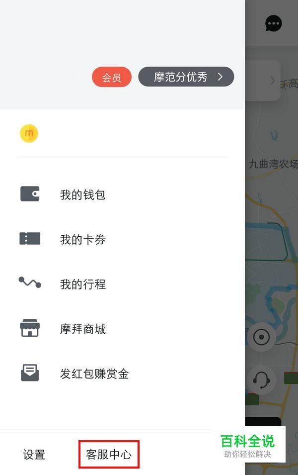 打开摩拜单车,点击左上角的头像,弹出菜单栏,点击下方的“客服中心”;
