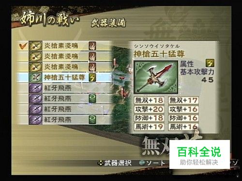 武器名称 神枪五十猛尊 所属人物 真田幸村 获得关卡 上田城防卫战 游戏模式 无双演武限定 限定难度 难或以上 获得方法:开始后往地图右行,击破上田城门口的榊原康政、和仙石秀久,为金子美浓守的移动线路扫清障碍。接着从上田城左门突出,向地图左上方移动,而河下游的稻姬等将不必理会。击破前来挡路的户田一西继续清扫道路,然后击破把守水门的本多忠政,以援护金子美浓守完成水计。 顺便击破真田信之完成防卫户石城的任务,再击破狙击金子美浓守的风魔小太郎,水计发生后,稻姬等将会负伤撤退,而服部半藏及其影武者会分别出现在户石城、上田城城门和我军总大将身边,一定要最后击破总大将附近的半藏之后便会有贵重物品报告出现,在水门附近。笔者装备的就是炎枪素戔鸣,因为难度不高,所以杀敌犹如摧枯拉朽,全程也就六分钟左右。