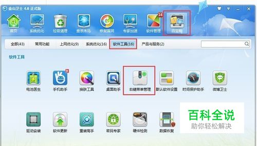 打开金山卫士中的“右键菜单管理”工具 打开金山卫士中的“百宝箱”,选择“软件工具”中的“右键菜单管理”工具。