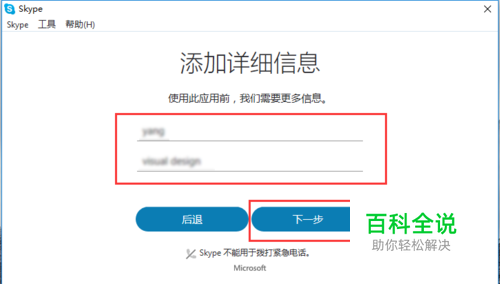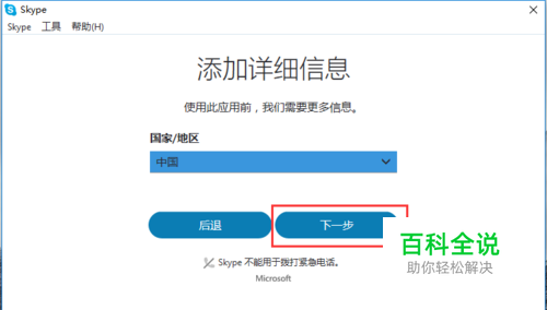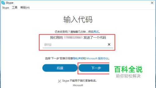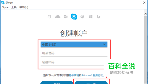 在skype创建账户页面,填写手机号和密码,点击【下一步】。
