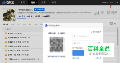 在网页上打开你朋友的的百度云网盘分享,点击右上角的登录,登录你自己的百度帐号(如果没有就去注册一个),这里是我朋友的网盘分享