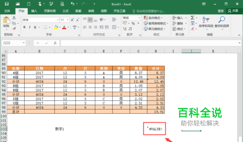 Excel公式出错,表示的结果为“#VALUE!”,举个简单的例子,比如在使用求和汇总的函数公式的使用,相加汇总是不可以出现其他除数字以为的才可以,否则就会出错,比如这里。