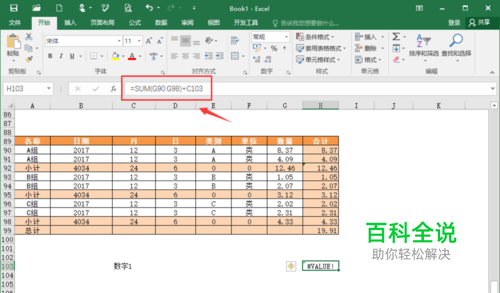 这里的公式为,=SUM(G90:G98)+C103,如果C103这个单元格里面内容是数字,那么就不会出错,但是现在内容是文字文本,那就结果会出现“#VALUE!”错误表示啦。