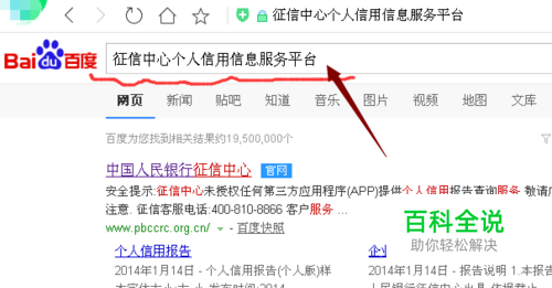 首先在自己电脑的的搜索引擎里输入关键字”征信中心个人信用信息服务平台“,点击搜索,如图