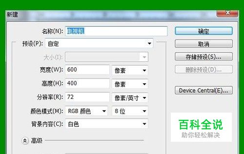 启动photoshop软件,新建一个命名为电视机的600像素X500像素的文件,如图。