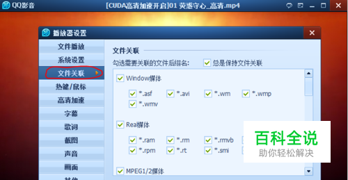 选择“文件关联”,选择全选(或者单独选择MP4,其他格式类似),之后点击“应用”就行了!如图所示: