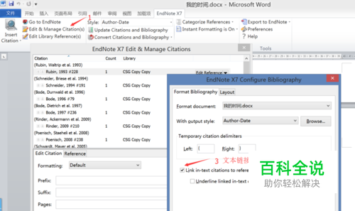 1. 需要快速的建立和取消word中加入参考文献的超链接,如图所示。勾选3中的Lik in-text....