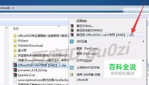 在下载的RAR压缩包文件上点击右键,选择解压缩到...,这里以下载的OFFICE2010x64版本为例