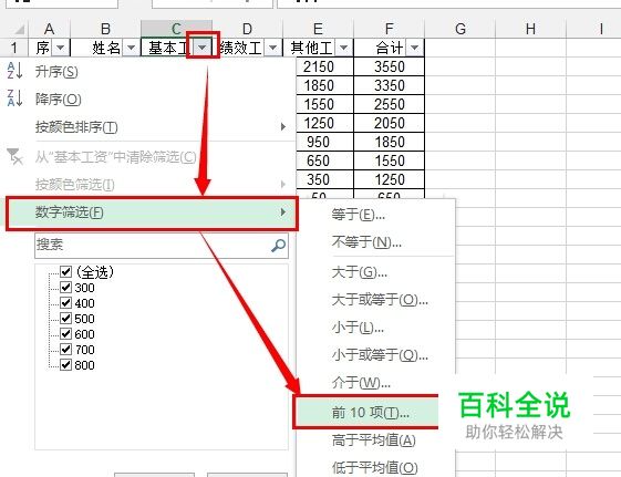 点击 基本工资列 后面的筛选按钮,然后选择 数字筛选,前10项 :