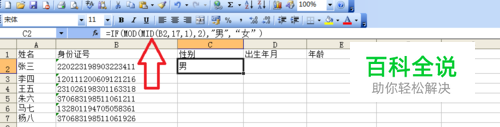 。找到带有身份证号码的EXCEL 表格,点击性别一列的第一个单元格,输入IF(MOD(MID(B2,17,1),2),"男",“女”),这里B2是身份证所在列,17,是身份证号的第17个数字,1指数字的长度。然后回车,鼠标移至右下角等待光标变成实心十字,按住下拉“男”,就会得到其他的性别了。