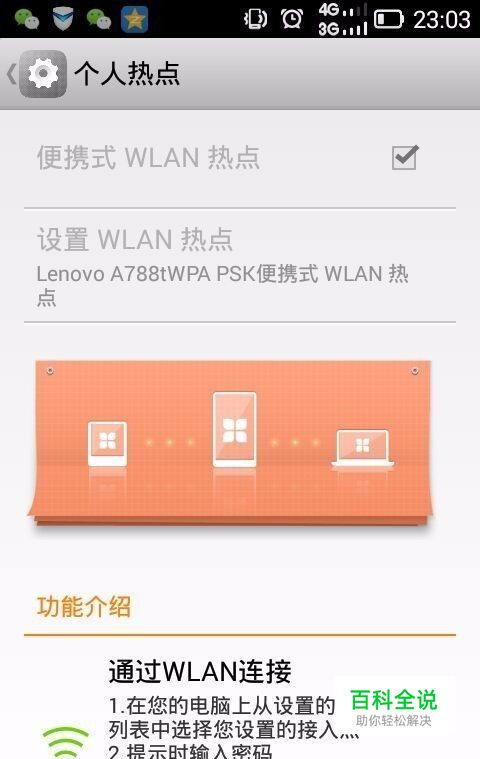 第三步,点击“选择WIFI连接”后,会出现显示“打勾”标志的代表已打开个人热点。我们再可以点击下方的“设置WLAN热点”来进行对热点的设置。