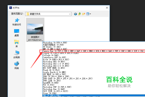 打开安装好的PS,选择【文件】-【打开为】,在弹出的窗口中选中自己要修改的图片,并且选中打开的方式,如果所示,在下拉列表中选择【Camera Raw】