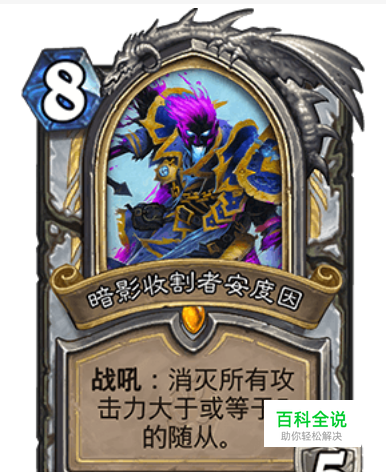 炉石传说暗影收割者安度因属性如下: 消灭所有攻击力大于5或者等于5的随从,并且变身英雄技能虚空形态造成2点伤害,在使用一张卡牌后复原你的英雄技能。