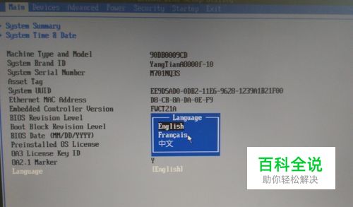 进BIOS后主界面最下面一个选项“Language”(语言),可将BIOS语言改为中文。