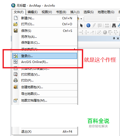 第三步:在不关闭这个对话框的情况下 去点击 “文件”菜单,对不要怀疑,这个时候菜单是能打开的。打开就能看到“登录”和“arcgis online”这两个选项了。