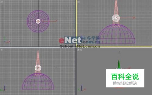 打开3DMAX7.0,单击创建面板下的几何体按钮,然后选择球体按钮,在场景中创建一个球体;接着选择几何体下的圆锥体按钮,在场景中创建1个圆锥体,设置半径1为800,半径2为0,高度为7500,高度分段数为5,端面分段为1,边数为24,再次在场景中创建1个球体,设置半径为900,分段为24。效果如图1所示: 图1